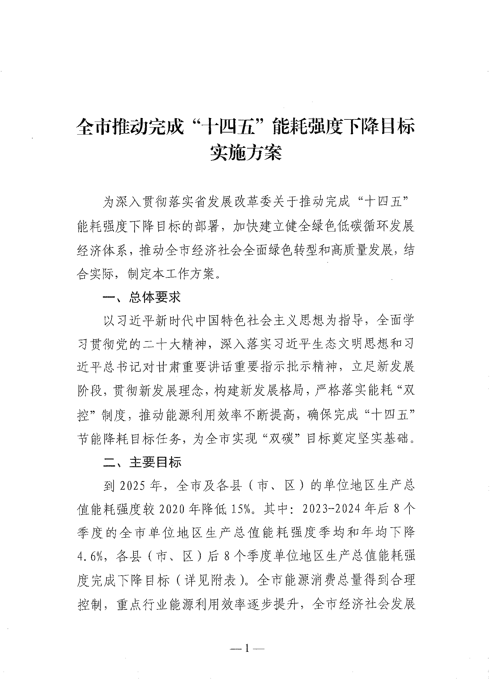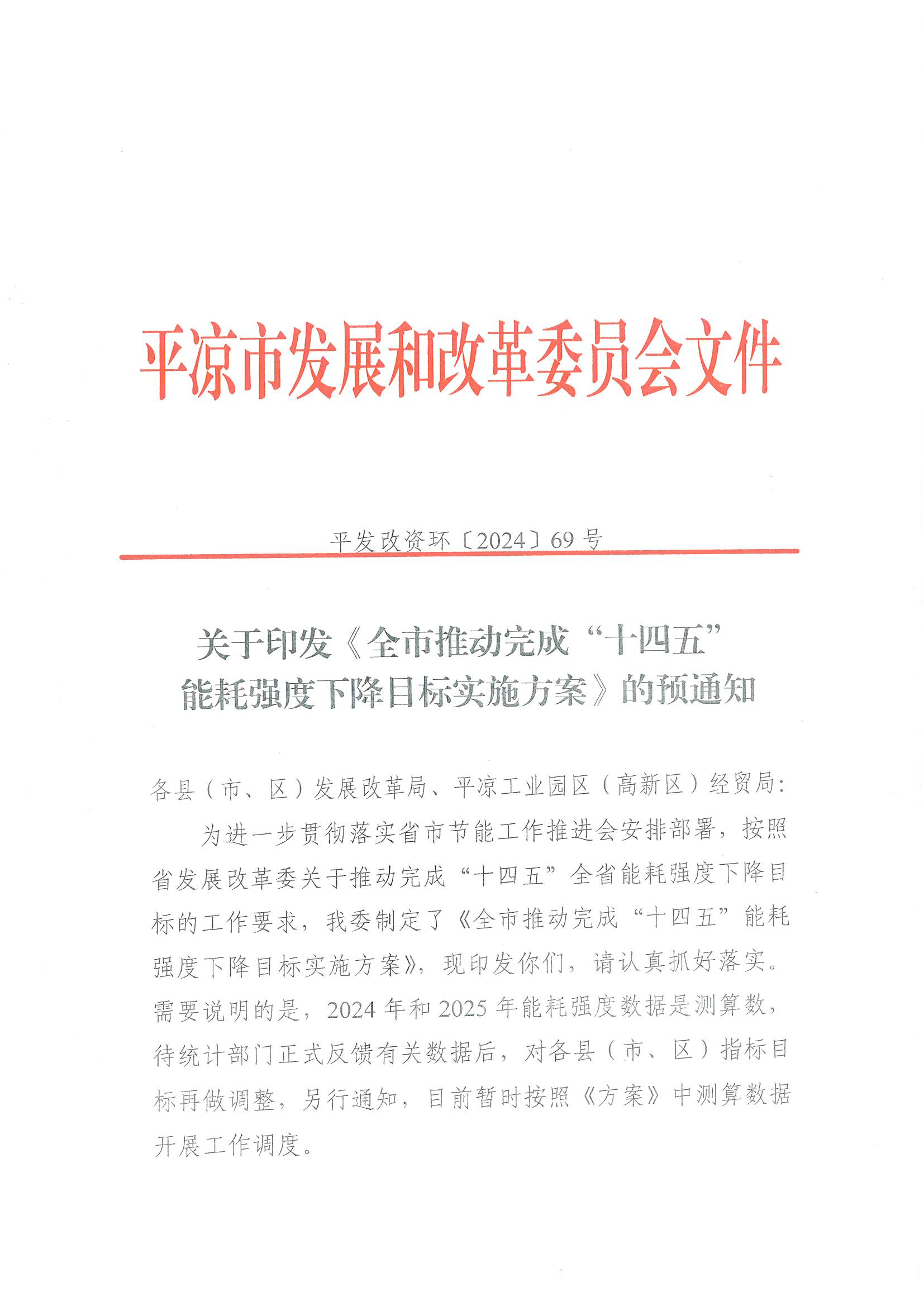 关于印发《全市推动完成“十四五”能耗强度下降目标实施方案》的预通知