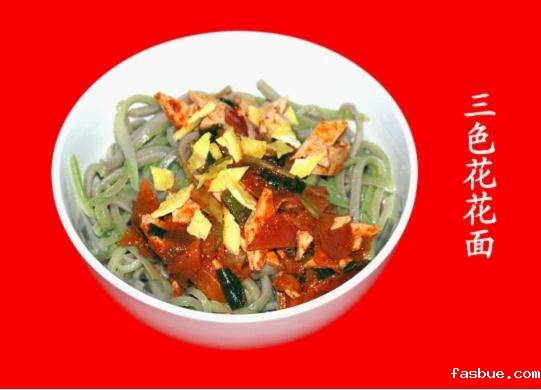 【制作】1、和好小麦面、高粱面、再用小麦面家菠菜做成绿面,即菠菜面;2、用小麦面和菠菜面将高粱面包住,用手擀面杖将其推擀即成白、红、绿层级即成。