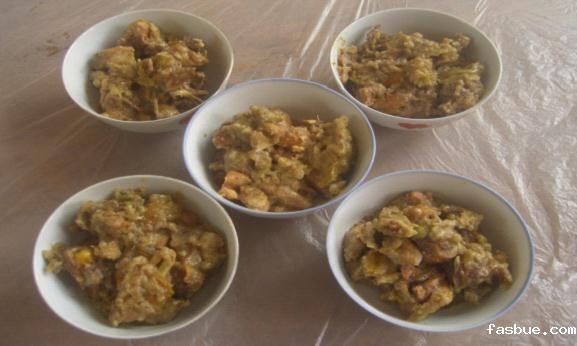 3、用发酵后的白面擀成面皮摊开上笼,将鸡块糊倒在面皮上,上锅用慢火蒸4小时后,出锅即成。
