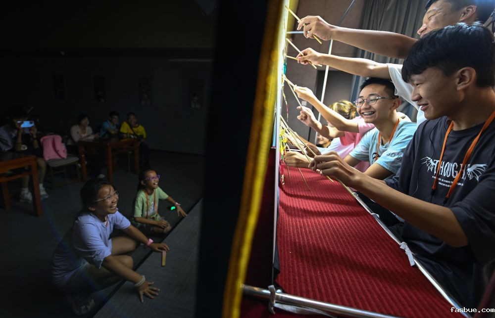 2023年8月8日,进行暑期研学的学生在位于陕西省西安市的中国秦腔艺术博物馆体验皮影戏演出。新华社记者 邹竞一 摄