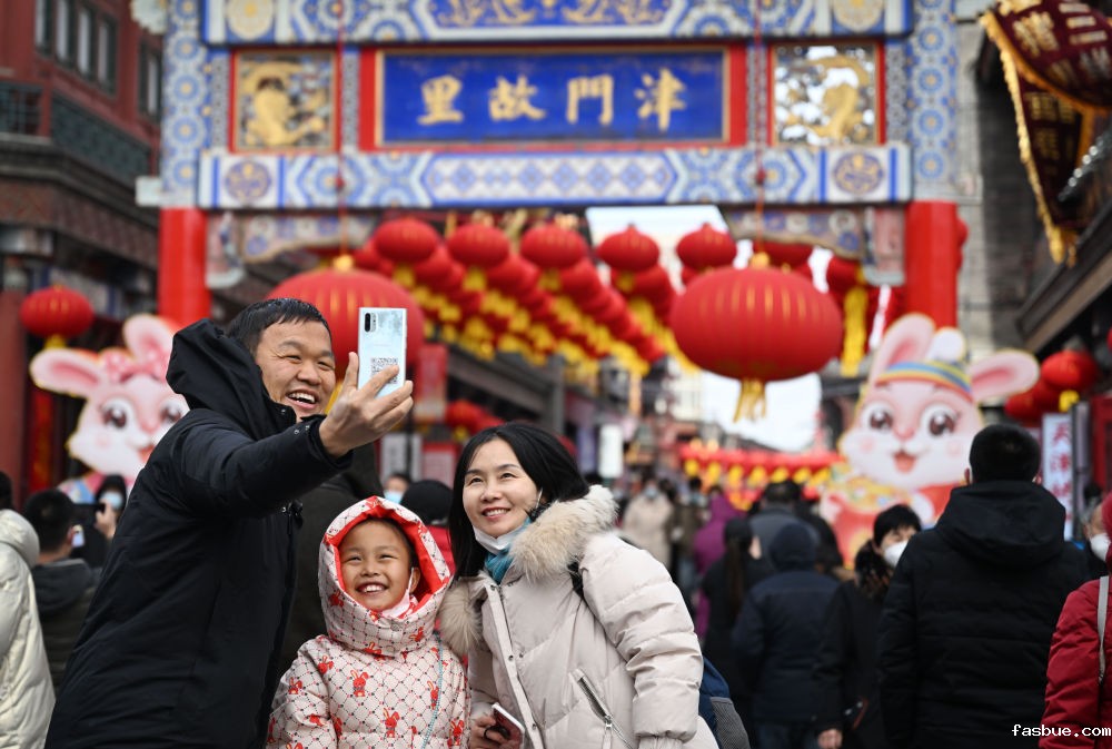 2023年1月26日,农历大年初五,游客在天津古文化街留影。新华社记者 赵子硕 摄