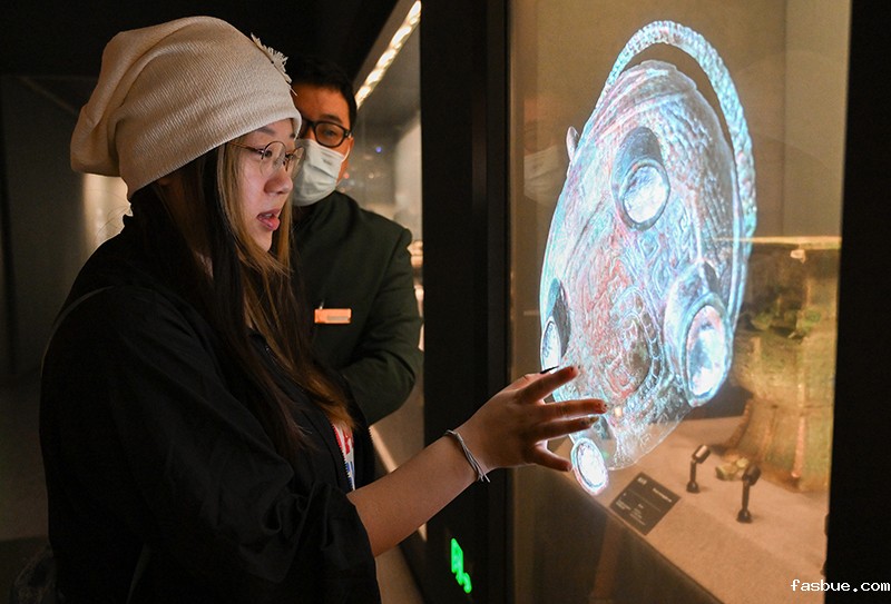 金面具、青铜神坛、青铜骑兽顶尊人像……四川三星堆博物馆新馆内,一件件精美的出土文物令人目不暇接。