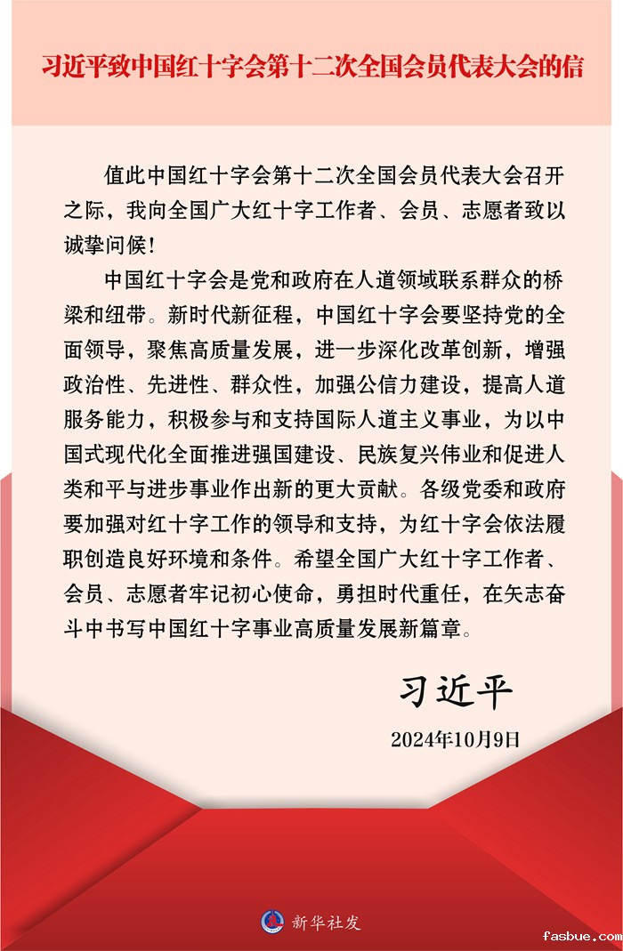 新华社北京10月9日电 在中国红十字会第十二次全国会员代表大会召开之际,中共中央总书记、国家主席、中央军委主席习近平致信大会,向全国广大红十字工作者、会员、志愿者致以诚挚问候,并对做好红十字工作提出希望。