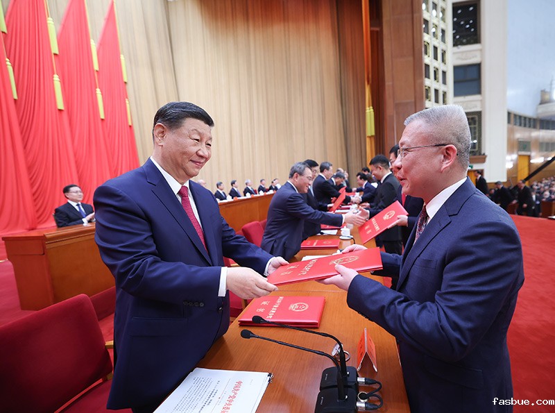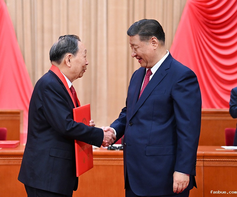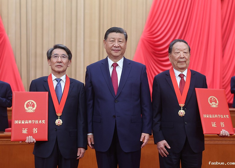 6月24日,全国科技大会、国家科学技术奖励大会和中国科学院第二十一次院士大会、中国工程院第十七次院士大会在北京人民大会堂隆重召开。中共中央总书记、国家主席、中央军委主席习近平向获得2023年度国家最高科学技术奖的武汉大学李德仁院士(右)和清华大学薛其坤院士(左)颁奖。新华社记者 鞠鹏 摄