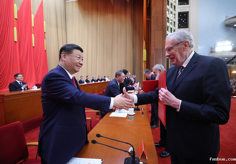 6月24日,全国科技大会、国家科学技术奖励大会和中国科学院第二十一次院士大会、中国工程院第十七次院士大会在北京人民大会堂隆重召开。这是习近平等党和国家领导人同两位最高奖获得者一道,为获得国家自然科学奖、国家技术发明奖、国家科学技术进步奖和中华人民共和国国际科学技术合作奖的代表颁发证书。新华社记者 鞠鹏 摄