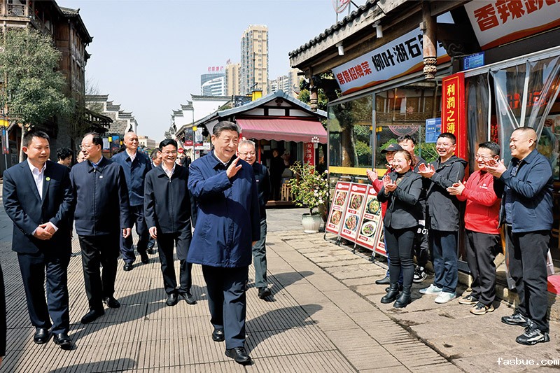 2024年3月18日至21日,中共中央总书记、国家主席、中央军委主席习近平在湖南考察。这是19日上午,习近平在常德河街考察时,同店主和游客亲切交流。新华社记者 王晔/摄