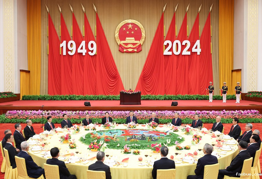 李强主持招待会,赵乐际、王沪宁、蔡奇、丁薛祥、李希、韩正出席招待会。约3000名中外人士欢聚一堂,共庆新中国75周年华诞。