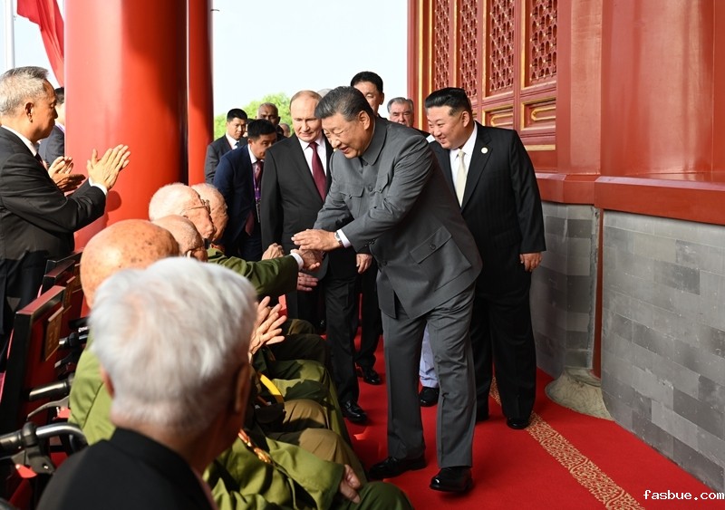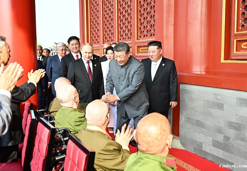 上午8时35分,习近平同出席大会的外方代表团团长拾级而上,登上天安门城楼。习近平同抗战老战士老同志代表亲切握手,向他们表示崇高敬意。