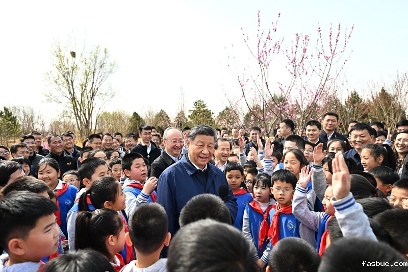 4月3日,党和国家领导人习近平、李强、赵乐际、王沪宁、蔡奇、丁薛祥、李希、韩正等来到北京市丰台区永定河畔参加首都义务植树活动。这是习近平同在场的干部群众、少先队员亲切交谈。新华社记者 殷博古 摄