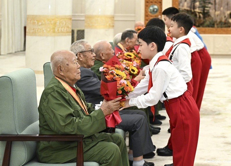 9月3日晚,纪念中国人民抗日战争暨世界反法西斯战争胜利80周年文艺晚会《正义必胜》在北京人民大会堂隆重举行。这是晚会开始前,少先队员向前来观看演出的抗战老战士老同志代表献花。