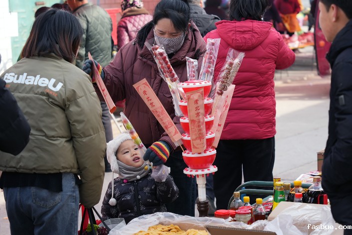 1月17日,在崆峒区花所镇,大人给孩子买糖葫芦。