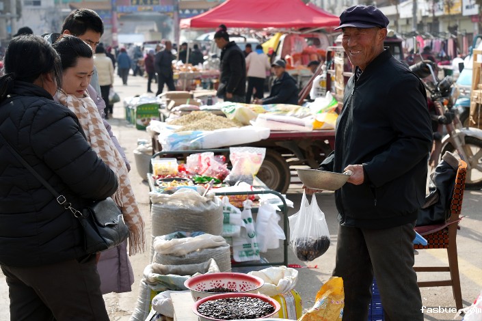 1月17日,在崆峒区花所镇集市售卖干果的商贩。